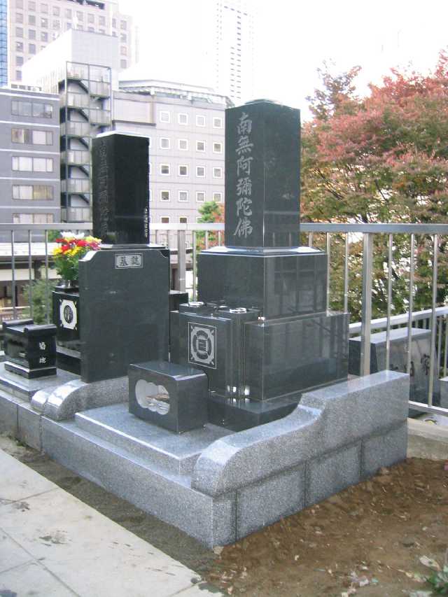 オールインド黒御影石高級型、上下蓮華、笠付塔婆立、墓誌付、バリアフリー型 -
